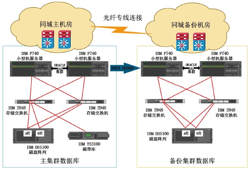 如圖所示,生產中心和災備中心之間各自采用2臺性能強勁的IBM P740小型機服務器和IBM DS5100存儲陣列搭建獨立的ORACLE 11G RAC集群。生產中心和災備中心間租用運營商專用光纖線路傳輸數據。利用ORACLE DATAGUARD技術,生產中心和災備中心的ORACLE RAC集群異步復制數據。同時災備中心的ORACLE RAC集群將為客戶其他分支業務提供查詢支持,充分分擔生產中心ORACLE RAC集群的負載,兼顧了性能和成本的平衡。生產中心配置IBM TS3100磁帶庫,配合IBM TSM備份軟件調度,每晚備份數據,同時建立每周定期磁帶離線、異地保存制度,實現同城容災負載分擔、異地離線備份的架構,既提高了核心數據庫集群性能,又為數據安全提供了充分保障。