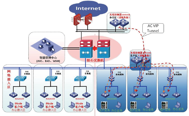 無線網絡架構采用的是“FIT AP+AC”的架構,亦即“瘦AP和無線控制器”的架構模式。無線網絡的設備涉及了無線控制器AC、無線接入點AP、PoE供電模塊。無線控制器通過“1+1”熱備的技術實現無線網絡的高可靠性,保障了無線網絡的業務正常運行。